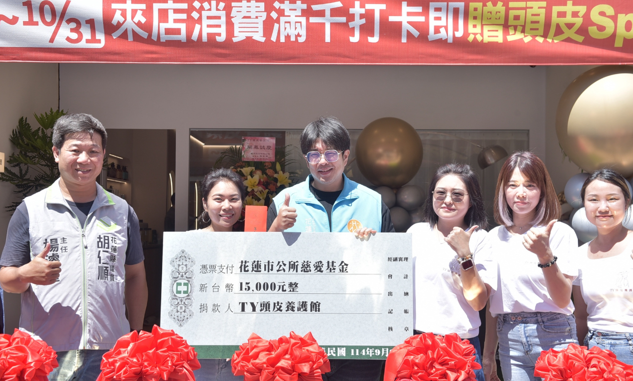 花蓮市在地美容服務業者 TY頭皮養護館,日前於本著取之於社會、用之於社會的理念,在舉行開幕典禮時捐出新台幣1萬5千元,挹注花蓮市公所慈愛基金,善盡企業社會責任。魏嘉彥市長親自接受善款,並回贈感謝狀,感謝TY頭皮養護館的愛心善舉。