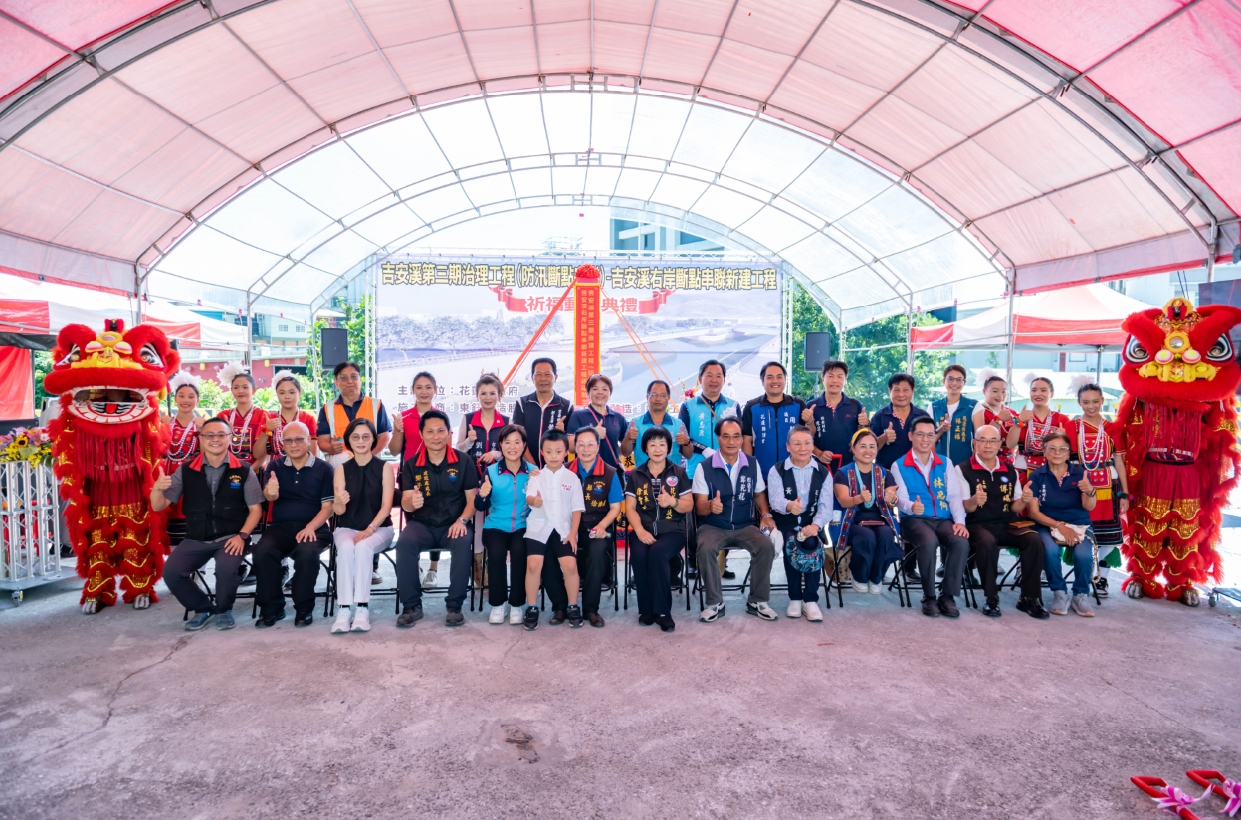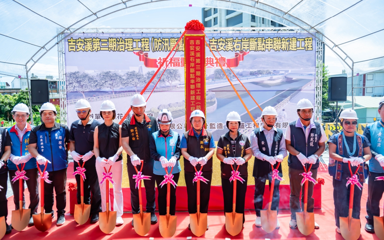 花蓮縣政府今(3)日於吉安鄉舉行「吉安溪右岸斷點串聯新建工程」動土典禮,該工程縣府自籌預算8,079萬元,辦理中央路吉安溪橋與中園排水匯流處之新建橋樑興建工程,此新建橋梁跨越中園排水連通三地,將可大幅提升通行上之便利,亦可緩解慶豐村、吉安村及宜昌村之車流,可做為日後防災避險之替代道路,為花蓮打造更友善宜居的環境。