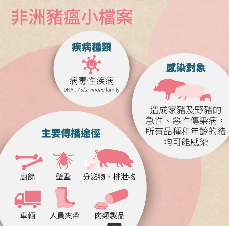 花蓮縣動植物防疫所長周黃得榮表示,非洲豬瘟病毒具高度傳染性與極高致死率,屬我國甲類動物傳染病。該病毒僅感染豬隻,且在環境中存活力極強,在糞便中可存活約11天、於冷凍豬肉中甚至可達1,000天。儘管此病非人畜共通傳染病,但目前仍無藥物或疫苗可供防治,一旦感染,死亡率可達百分之百,對畜牧產業與經濟影響重大。縣府提醒農友切勿使用來路不明的「疫苗」或防疫偏方,以免造成更大損失