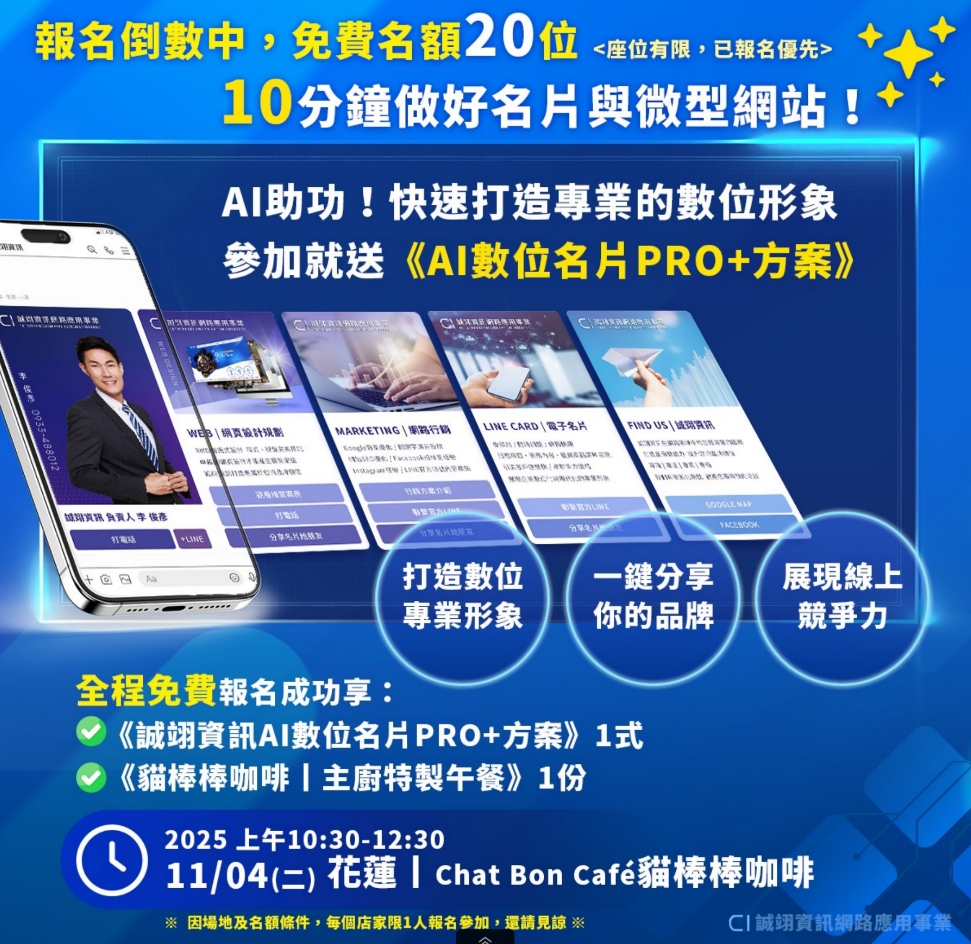 報名參加完全免費!成功報名的店家我們提供「貓棒棒咖啡丨主廚特製午餐」1份,並獲得「誠翊資訊AI數位名片Pro+方案」1式。現場教你如何用10分鐘打造專屬的數位名片,開啟行銷新模式,讓品牌更有曝光量、拓展商業人脈更快速方便!