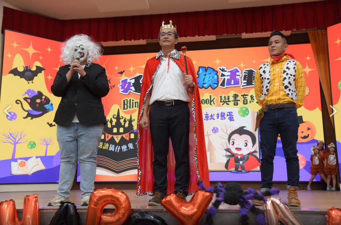 萬聖節將至,花蓮市公所與明義國小攜手舉辦「好書交換活動~Blind Date with a Book與書盲約」,今(23)日校園化身為奇幻書香派對。花蓮市長魏嘉彥特地帶著小丑面具登場,明義國小校長許傳德則化身童話故事中的國王,與全校師生同歡,場面熱鬧又溫馨。