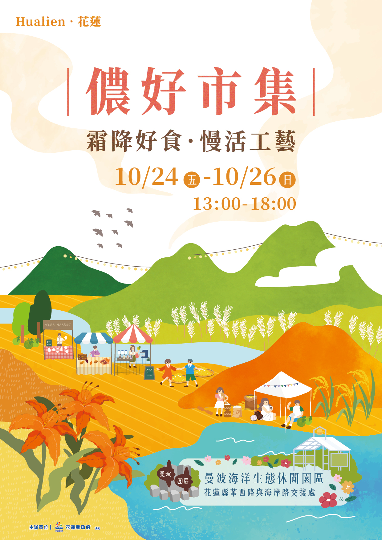活動主場「霜降好食・慢活工藝展售市集」將於10月24日至26日在曼波海洋生態休閒園區熱鬧登場,集結20組花蓮在地農漁品牌與工藝職人攤位,呈現秋日豐收的在地魅力。現場每日安排不同主題的手作體驗,包括藍染、木作小物、手工皂等,邀請親子與旅人共同參與,在悠閒氛圍中感受花蓮慢生活的美好。
