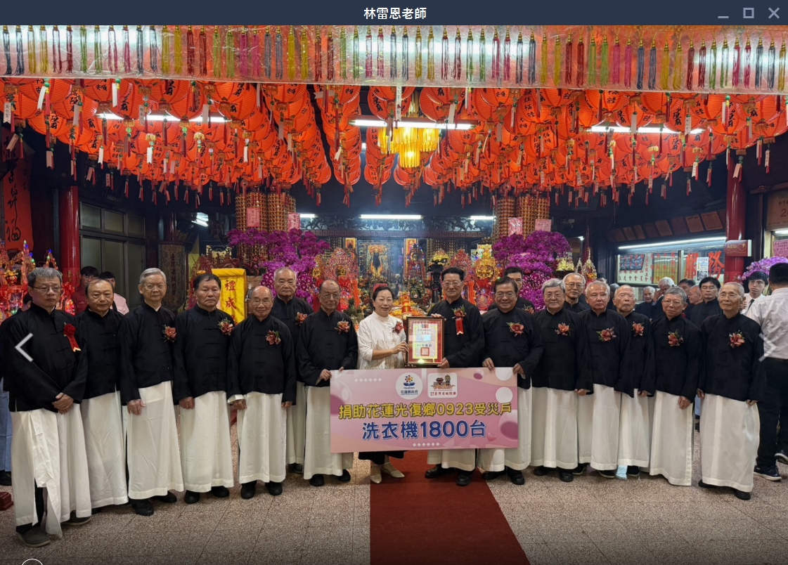 財團法人台北市台灣省城隍廟今(25)日舉行恭祝省城隍爺聖誕啟建(乙巳年)秋季祈安植福禮斗法會,並於法會中以實際行動關懷災區,捐贈1,800台洗衣機予光復鄉馬太鞍溪堰塞湖災害受災民眾。捐贈儀式由花蓮縣長徐榛蔚代表受贈,向台灣省城隍廟董事長蕭中川及全體信眾表達誠摯感謝。