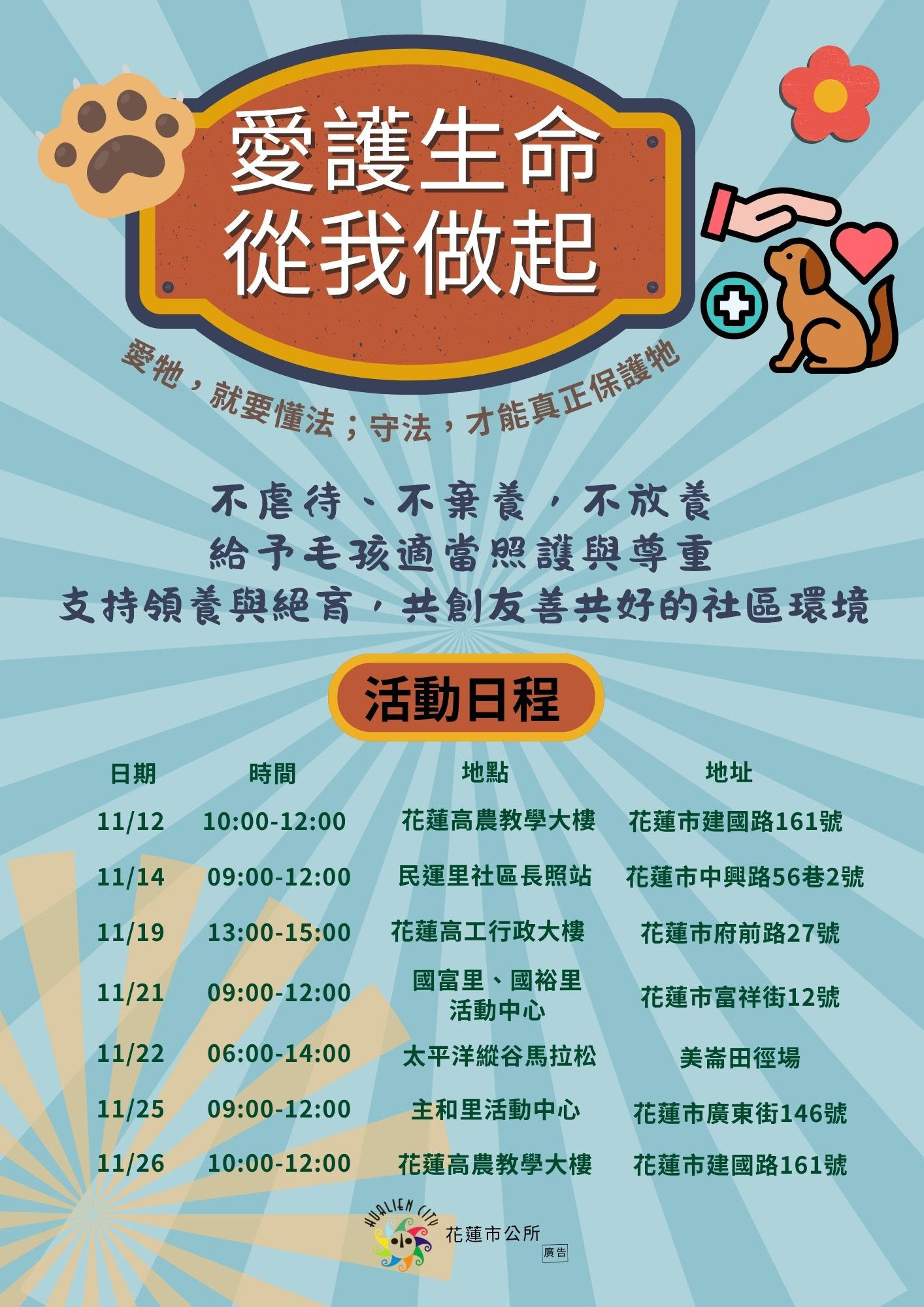 為提升市民對動物保護及正確飼養觀念的認識,花蓮市公所在114年度推動「動物保護宣導活動計畫」,以多元宣導方式深化民眾對《動物保護法》的了解,並建立尊重生命、友善動物的城市文化。