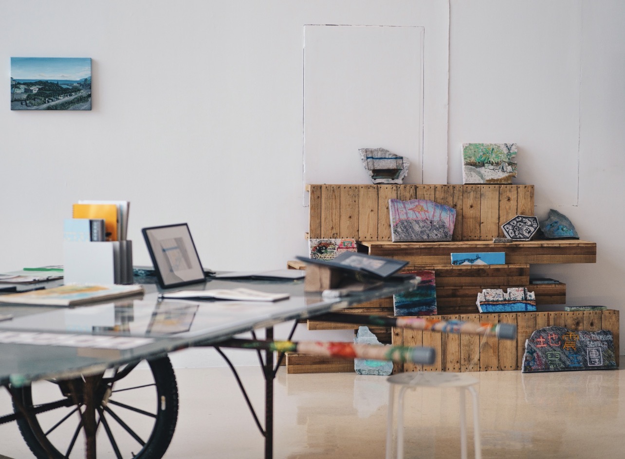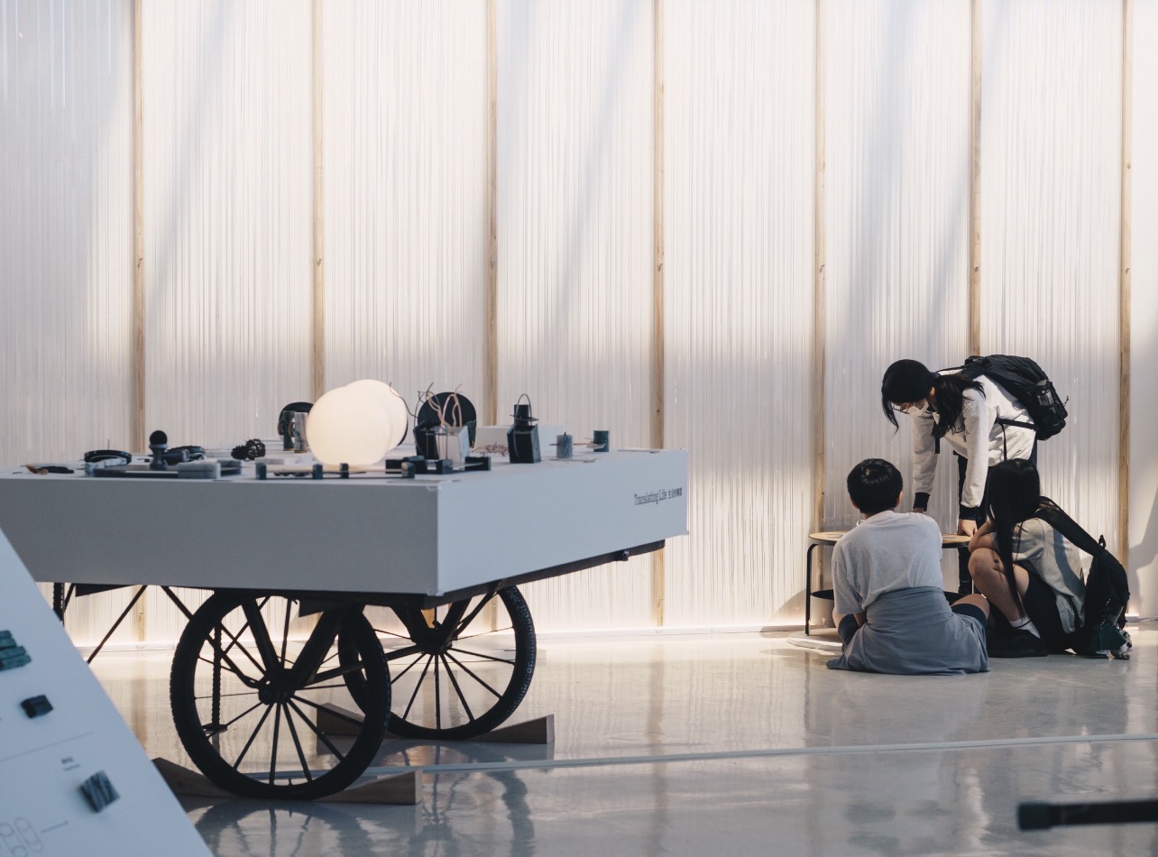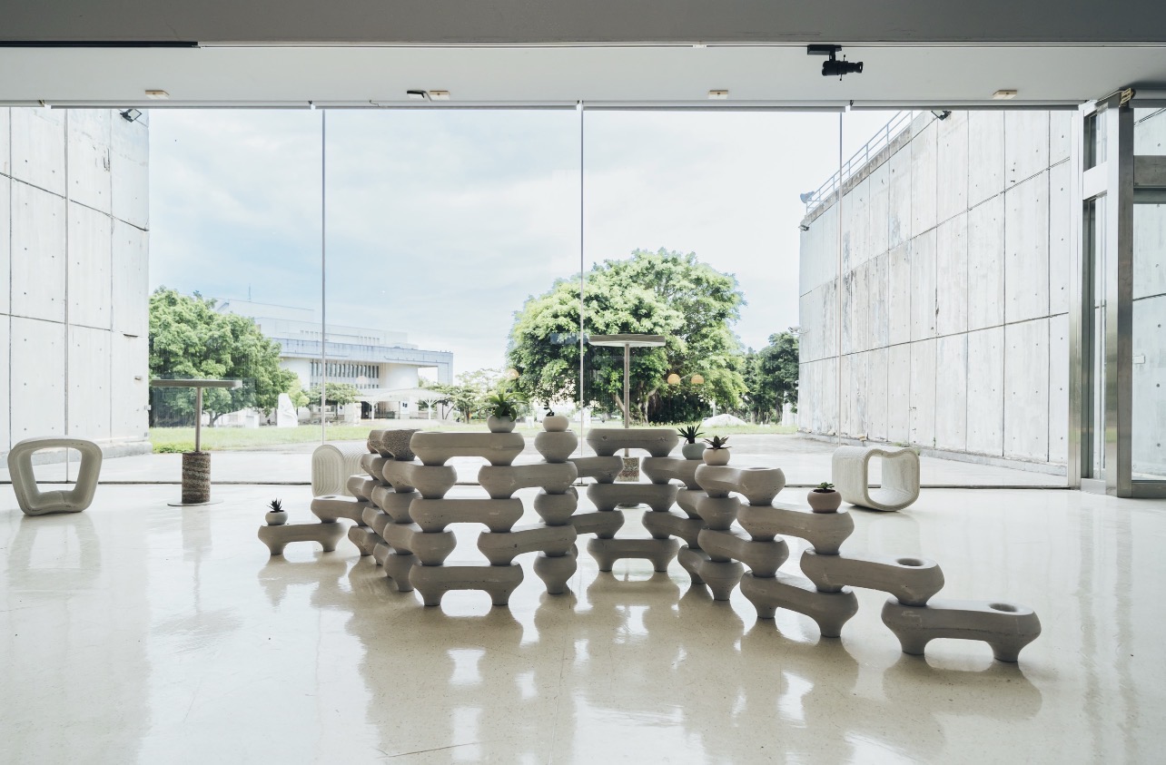 策展顧問王翔將展覽敘事整理為「情感修復、產業現場、未來共創」三個層次,讓災後的對話從藝術共鳴展開,進而引導觀者理解石材如何走入日常。策展團隊並向工廠借用補膠台車作為展台,面向迎光落地窗,需繞行方能看見全貌,讓觀眾在移動中想像產業現場,感受災後再興的力量。
