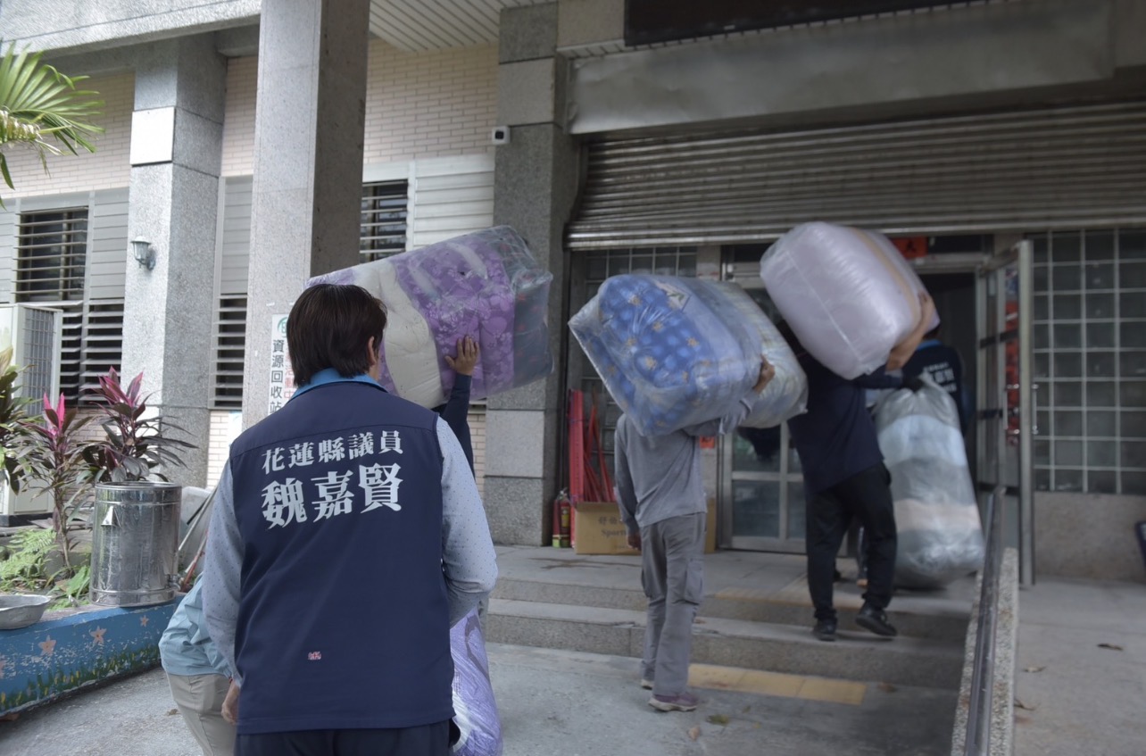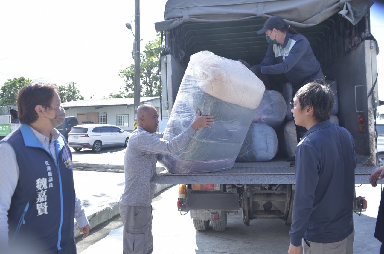 本次捐贈物資數量龐大,花蓮市公所清潔隊主動協助物資存放、整理及載運作業,讓捐贈流程更加順暢。12月9日花蓮市議員魏嘉賢偕同花蓮市公所蘇浩然秘書與清潔隊同仁南下光復鄉,將棉被等寢具分送至各村落,期盼把社會關懷第一時間送到需要的朋友手中。