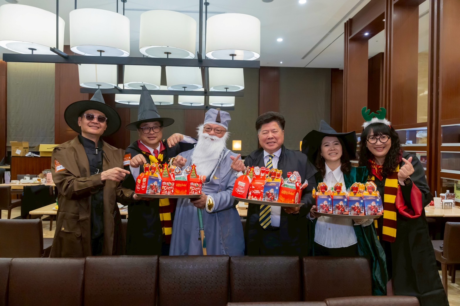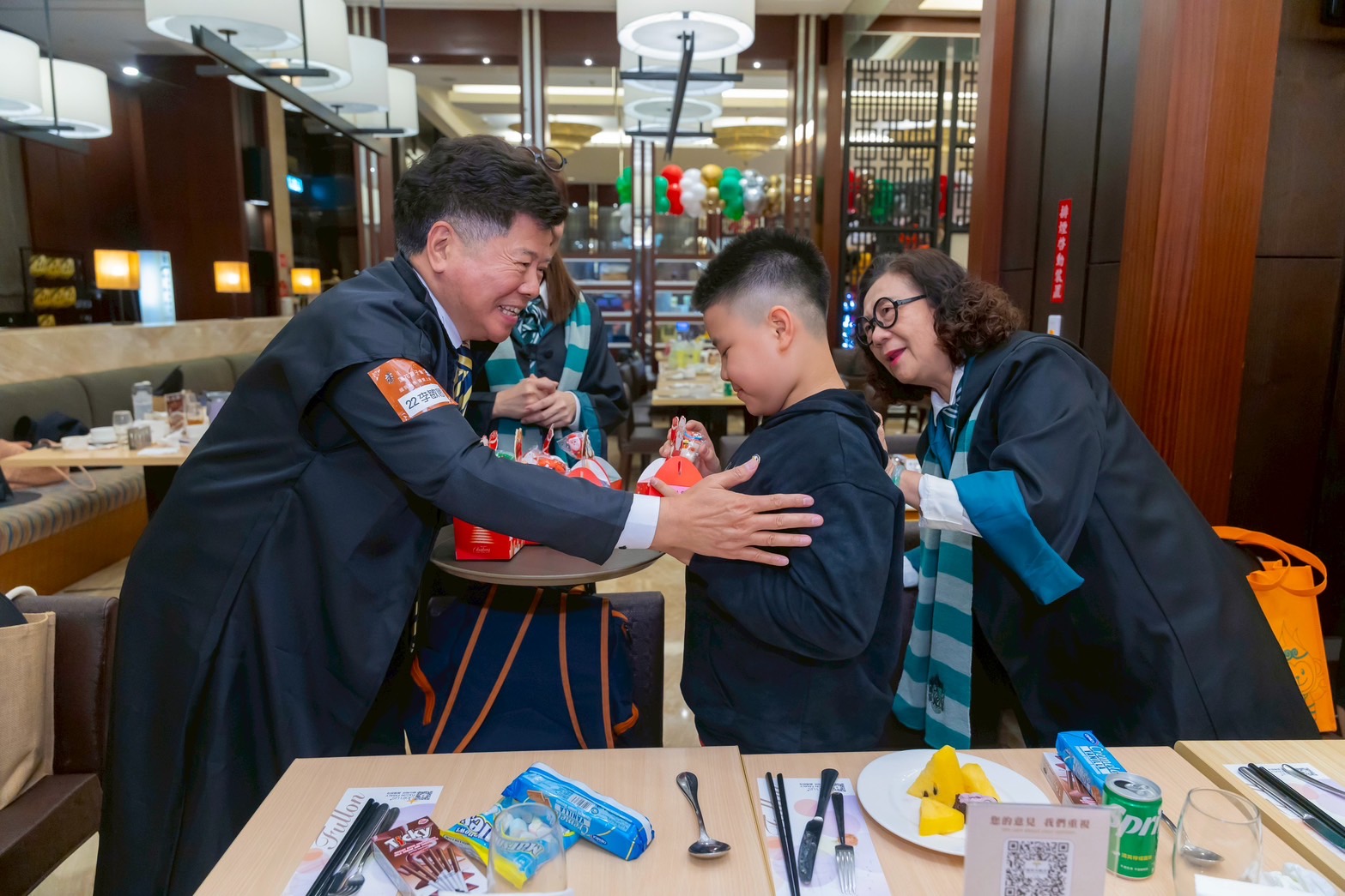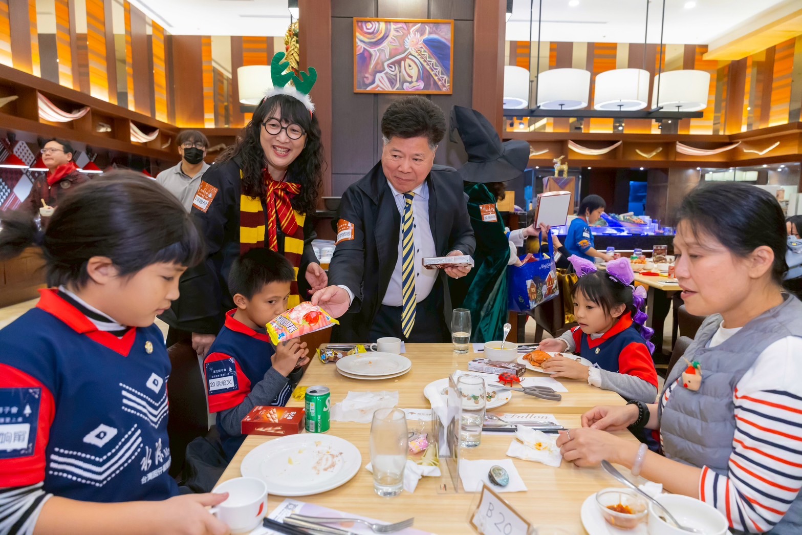 為了讓學童更放鬆,獅友們將會場妝點成節慶舞台,並以《哈利波特》元素設計迎賓橋段,多位獅友換上角色造型,在入口與席間主動與孩子打招呼、合影互動,笑聲很快填滿整個空間。蓮花獅子會長劉正帆表示,偏鄉孩子受地理與家庭條件影響,較少有機會接觸飯店餐敘等情境,但他們對生活的期待不該因此被限制,因此將此方案列入年度服務規劃,盼以「陪伴」把孩子帶進更寬廣的世界。