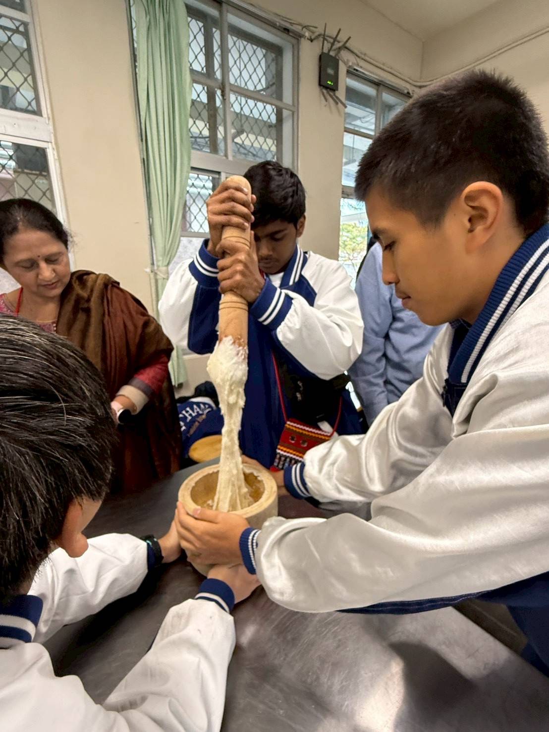 活動首日,宜昌國中精心規劃溫馨而隆重的歡迎會,由學生擔任接待與引導角色,透過音樂、互動與真誠笑容,讓遠道而來的印度師生迅速融入校園。隨後展開一系列以「生活即課程」為核心的交流活動,安排搗麻糬體驗,讓印度師生親手感受台灣傳統飲食文化的節慶意涵;並結合手作鳳梨酥課程,從食材、製作到分享,深入認識台灣在地特色點心,現場氣氛溫暖熱絡,也成為最受歡迎的文化交流時刻之一。