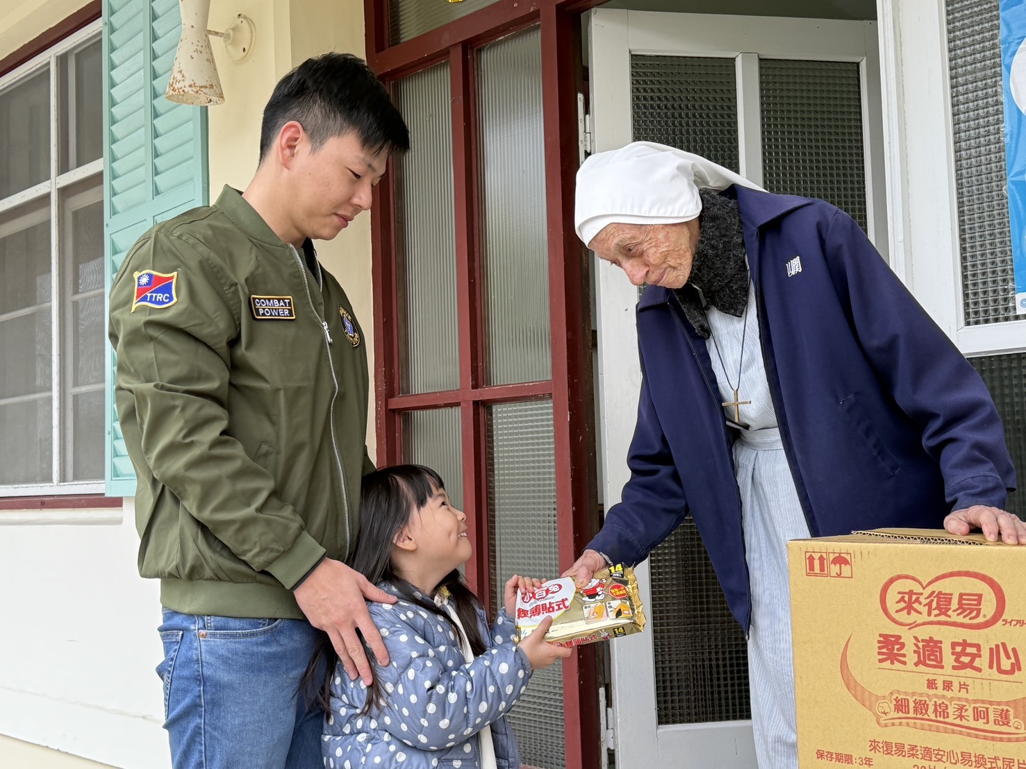 臺東縣後備指揮部上士林煜文利用週日休假來到小鎮療養院,募集親友的愛心購買尿布等民生物資進行公益活動。上午在縣議員陳宏宗秘書陪同下前往療養院,就讀幼兒園的女兒拿出零用錢購買暖暖包送給修女們禦寒,修女開心接受並直呼是家長做了身教的最好示範。