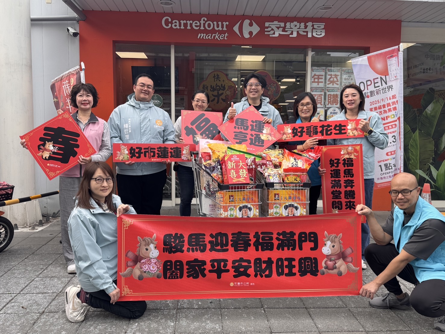 在家樂福超市,魏嘉彥等人推的購物車逛超市,推車裡有應景年節的糖果、餅乾禮盒之外,還有衛生紙、白米、泡麵等生活用品。魏嘉彥感謝熱心人士、企業及社團捐款給市公所慈愛基金,市公所特地採購愛心禮券,讓低收入戶及中低收入戶的家庭可以購買年節應景的物品。