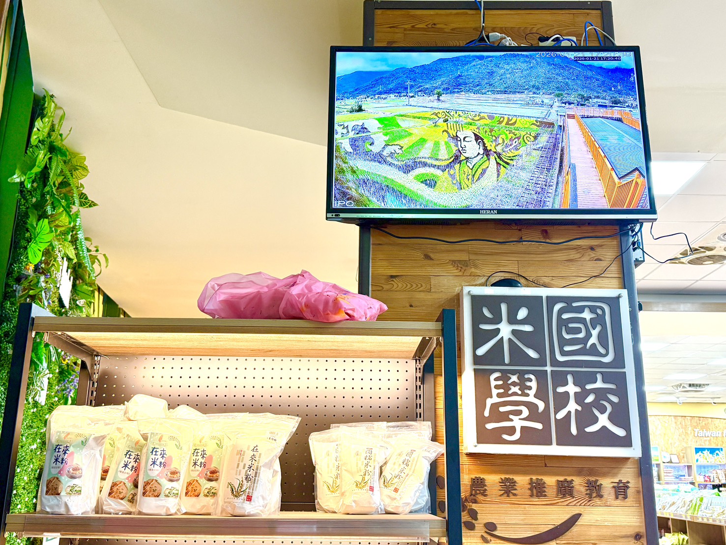 關山鎮農會今年不只在二樓的平台增加一處「最佳觀景拍照區」,昨天更是完成現場直播系統的架設;現在民眾只要在米國學校的農產品大賣場螢幕即可清楚看見彩繪稻田的全貌現況,風吹草動彷彿增添媽祖娘娘護佑大地的生動性。