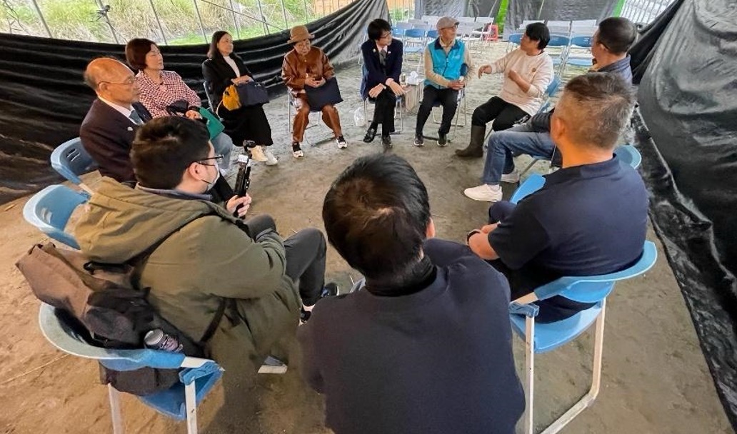 在參訪農場過程中,更有一段溫馨小插曲。秘書長羅浚晅看到剛發芽的向日葵小苗,動了想要養花送給家人的念頭,他從邦查農場蘇秀蓮手中接下 6 株向日葵小苗,承諾會在大家的監督下,將向日葵細心呵護長大開花,也期許邦查農場盡速復耕,早日恢復往日美景。