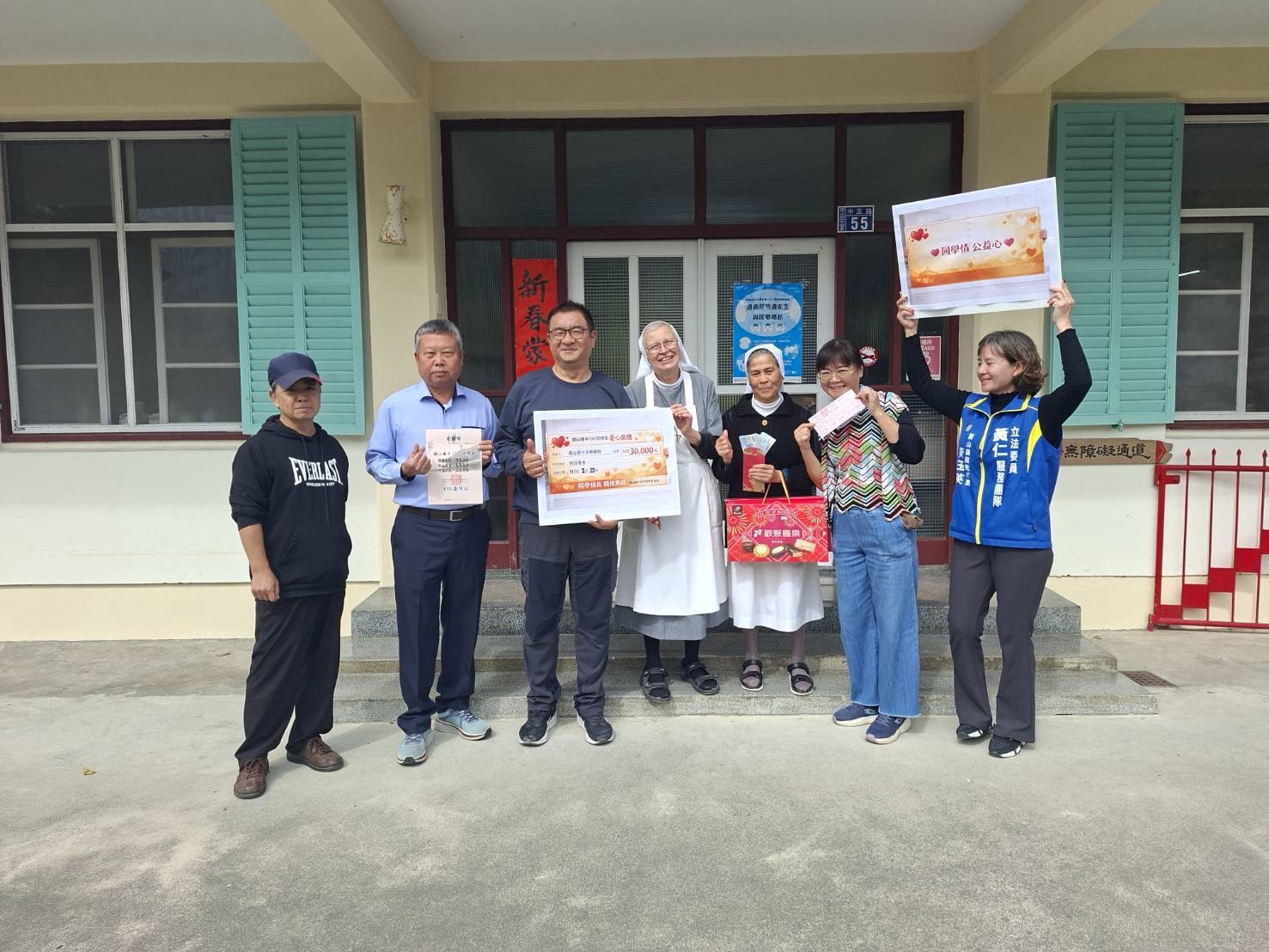 關山國中1357同學會上午委由關山鎮公所秘書林梓群、關山鎮農會秘書詹坤桂、臺東縣議員陳宏宗秘書周福安、立法委員黃仁秘書黃玉英四位秘書同學聯袂前往「聖十字架療養院」,帶著同學會的結餘款3萬元和餅乾禮盒捐給聖十字架療養院,感謝療養院長期以來對院民們的悉心照顧。