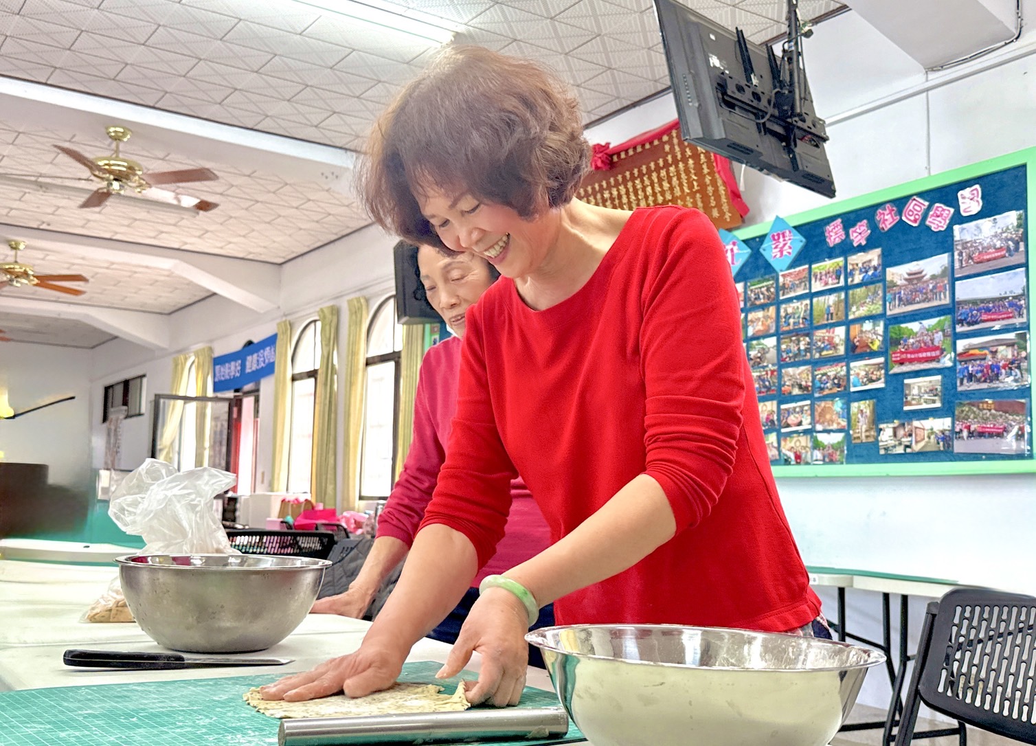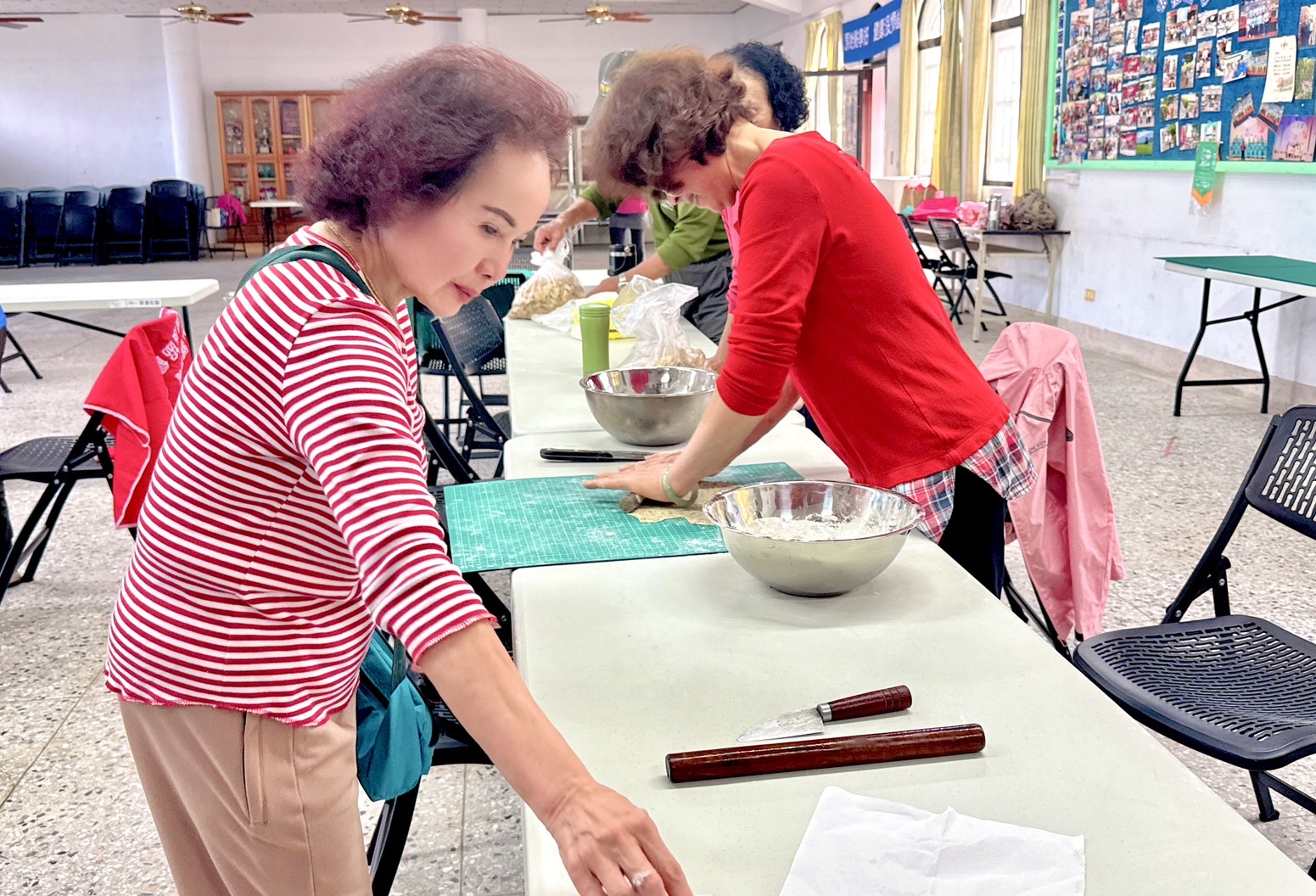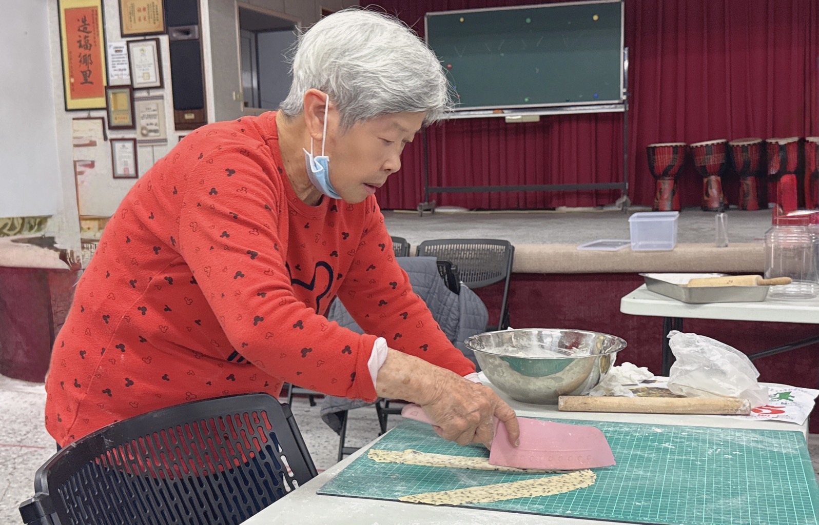 里壠社區發展協會理事長林韋君特地邀請社區的美食達人陳愛卿來分享如何製作零嘴「巧果」,現場的許多阿公、阿嬤興奮的表示,年輕開始就很喜歡吃「巧果」,而從前想吃都是得到市場去購買,沒想到現在可以學習如何做很有成就感。