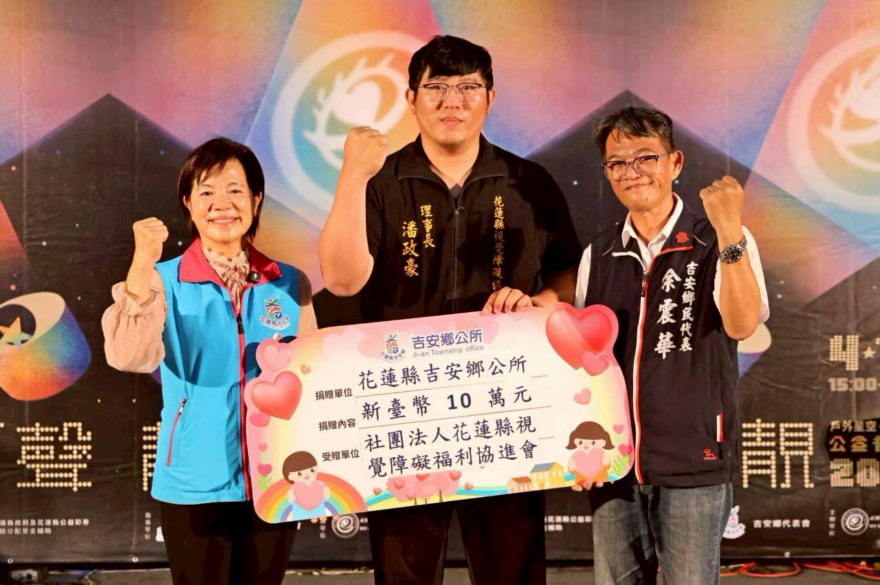 吉安鄉公所長期關懷弱勢族群協力與各項福利支持,昨(18)日晚間再度以實際行動傳遞溫暖。花蓮縣視覺障礙福利協進會舉辦結合公益、生命教育、歌唱與樂器演奏的「靚靚原聲戶外星空生命教育公益音樂會」,活動吸引眾多鄉親踴躍參與,在樂聲與掌聲中感受生命的力量與人間的溫情。鄉長游淑貞出席捐贈仁愛基金十萬元傳達對弱勢團體的關懷,並接受該協會理事長潘正豪頒發感謝狀,以感謝游鄉長長年支持與鼓舞視障族群懷抱正能量迎向未來。