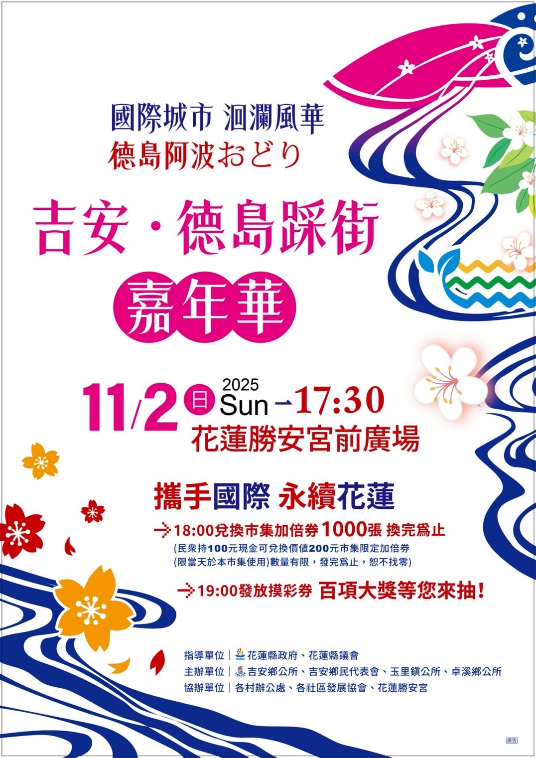 這場跨鄉鎮、跨國界的文化交流盛事,上午9點將於玉里鎮藝文中心率先登場,下午5點在吉安勝安宮延續踩街熱潮,現場不僅有台日尬舞互動,主辦單位更準備超過3,000份宣導品與百項摸彩好禮,並提供市集加倍券1,000張(100元兌換200元市集券),邀請鄉親共襄盛舉,一起感受花蓮的熱情與文化能量。相關活動訊息可連結官網查詢:https://www.ji-an.gov.tw/culture/events/ufRBamVzMrM6 。