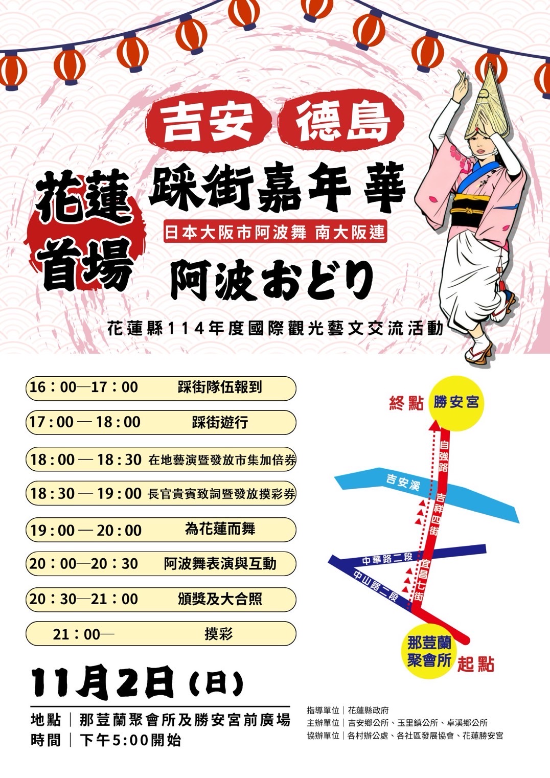 吉安鄉公所為強化國際知名度,促進國際間文化與觀光產業效益,延續與日本德島縣的友好盟約,並將於11月2日舉辦「國際城市‧洄瀾風情-吉安、德島暨玉里、卓溪民俗文化交流活動」。鄉長游淑貞特別邀請擁有400年歷史的日本德島南大阪連阿波舞團來台獻藝,並在吉安場安排踩街演出,讓鄉親能近距離欣賞來自日本的傳統舞蹈之美。她同時提醒民眾,2日活動下午5點起約一小時,從自強路慈惠一街路口至慈惠四街將進行部分路段封街交管,造成部分用路人不便之處,敬請見諒,同時籲請民眾提前改道、配合交管措施,並且注意安全、小心駕駛。