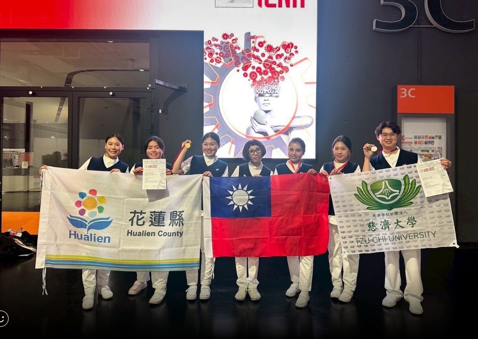 花蓮縣政府青年發展中心輔導慈濟大學創新團隊,以「多點式醫療管路固定暨調整裝置」及「智能約束裝置」兩項創新醫材,於 2025 iENA 德國紐倫堡國際發明展榮獲金牌及銀牌殊榮!得獎團隊由護理學系林祝君副教授兼副研發長帶領,成員包含護理系碩士生游子毅及學士生葉家妍、黃馥珊、陳芷婷、李薇臻、詹意如等七名青年。師生於會場揮舞國旗、縣旗與校旗,展現台灣花蓮青年在醫療創新領域的自信與實力。此外,慈濟大學羅文瑞名譽校長亦以「可攜式免電力逆洗型淨水裝置」榮獲金牌與德國發明協會特別獎,體現慈濟教育兼具人文關懷與永續創新精神。