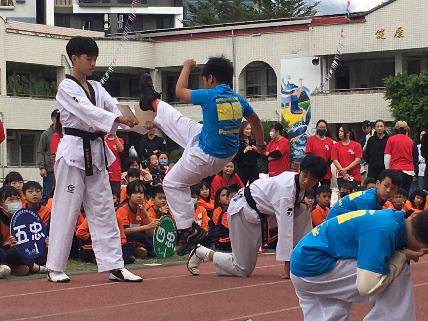 跆拳道隊在各縣市級比賽為明恥國小拿下許多優異成績,孩子們收起平時訓練認真嚴肅的態度,結合音樂和舞蹈,帶給大家活潑動感的跆拳舞,展現不同的力與美;網球隊更是明恥最大的運動團隊,歷年佳績不斷,在現場為所有來賓展現了最精湛的球技與練習日常,讓大家看到網球小將的不退縮、奮戰到底的精神。最後由明恥幼兒園帶來向快樂出發,天真活潑萌動的模樣,吸引大群的家長拍照不斷,為明恥國小校慶開幕式留下美麗的回憶,大家共同歡慶此次明恥國小85週年校慶運動會。