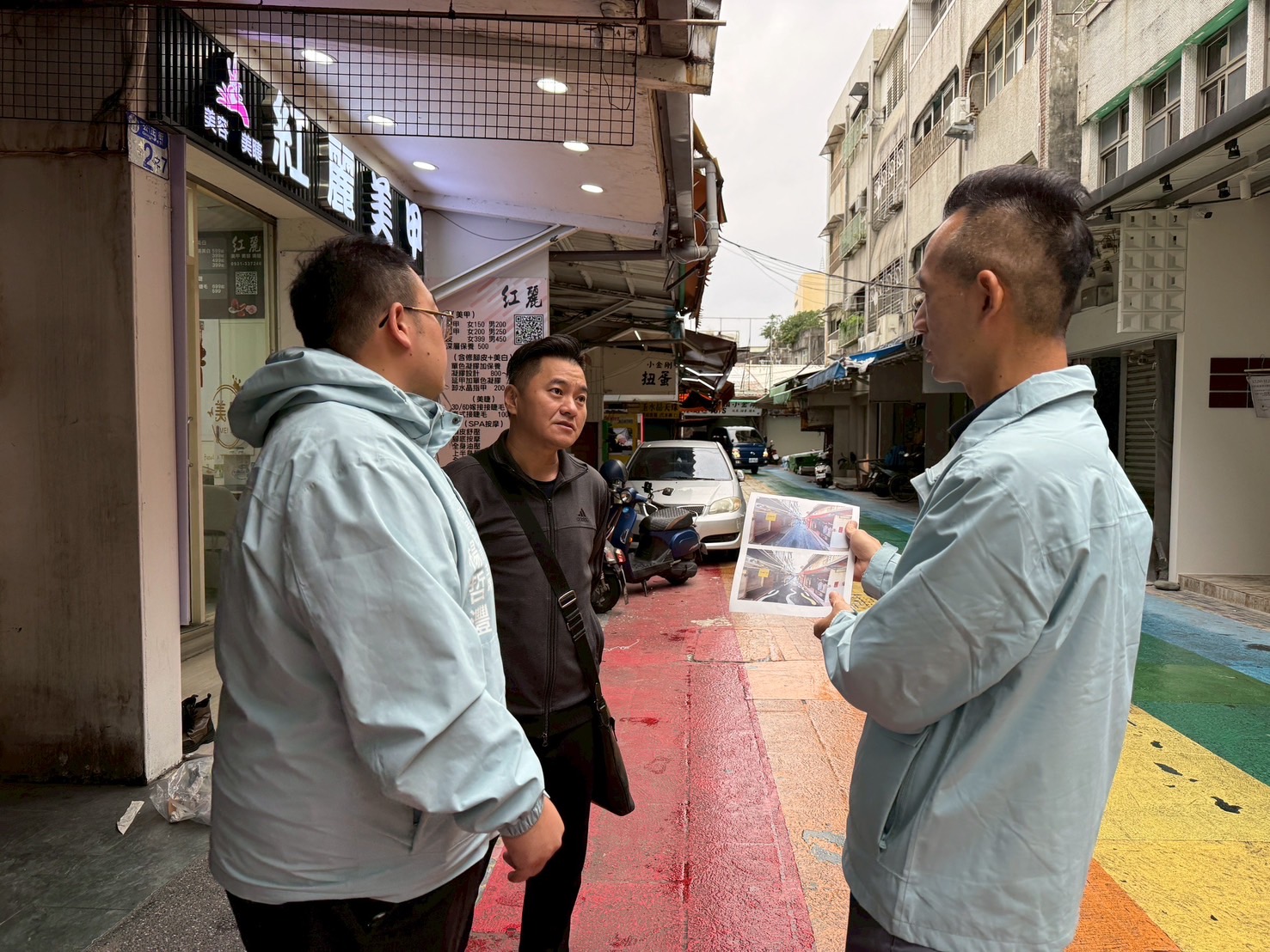 花蓮市民代表會主席楊哲灃26日邀請市公所建設課長徐國城前往大禹街會勘,民生里長吳明崇及花蓮市百年老街商圈發展協會總幹事黃智章也到場,反映地方與店家意見。