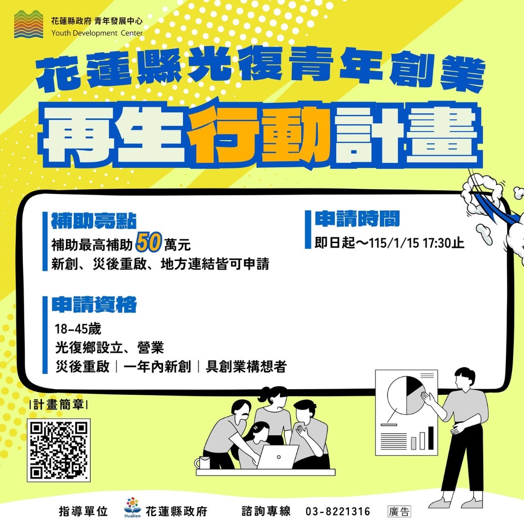 花蓮縣政府為協助光復地區青年於溪堰塞湖災害後加速復業與創業,推動「光復青年創業再生行動計畫」,提供青年創業與店家復業實質補助。縣府提醒,本計畫申請期限將於115年1月15日(四)17時30分截止,距離截止日已不到一個月,請有意願者務必把握時間、不要錯過。