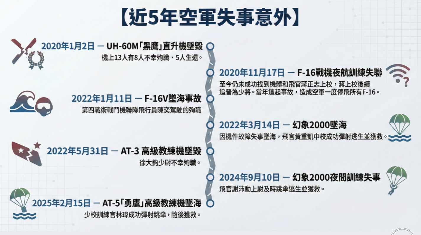 回顧近5年來,我國空軍已發生至少8起升空演訓相關的重大事故,涉及多款主力與訓練機型,整理如下: