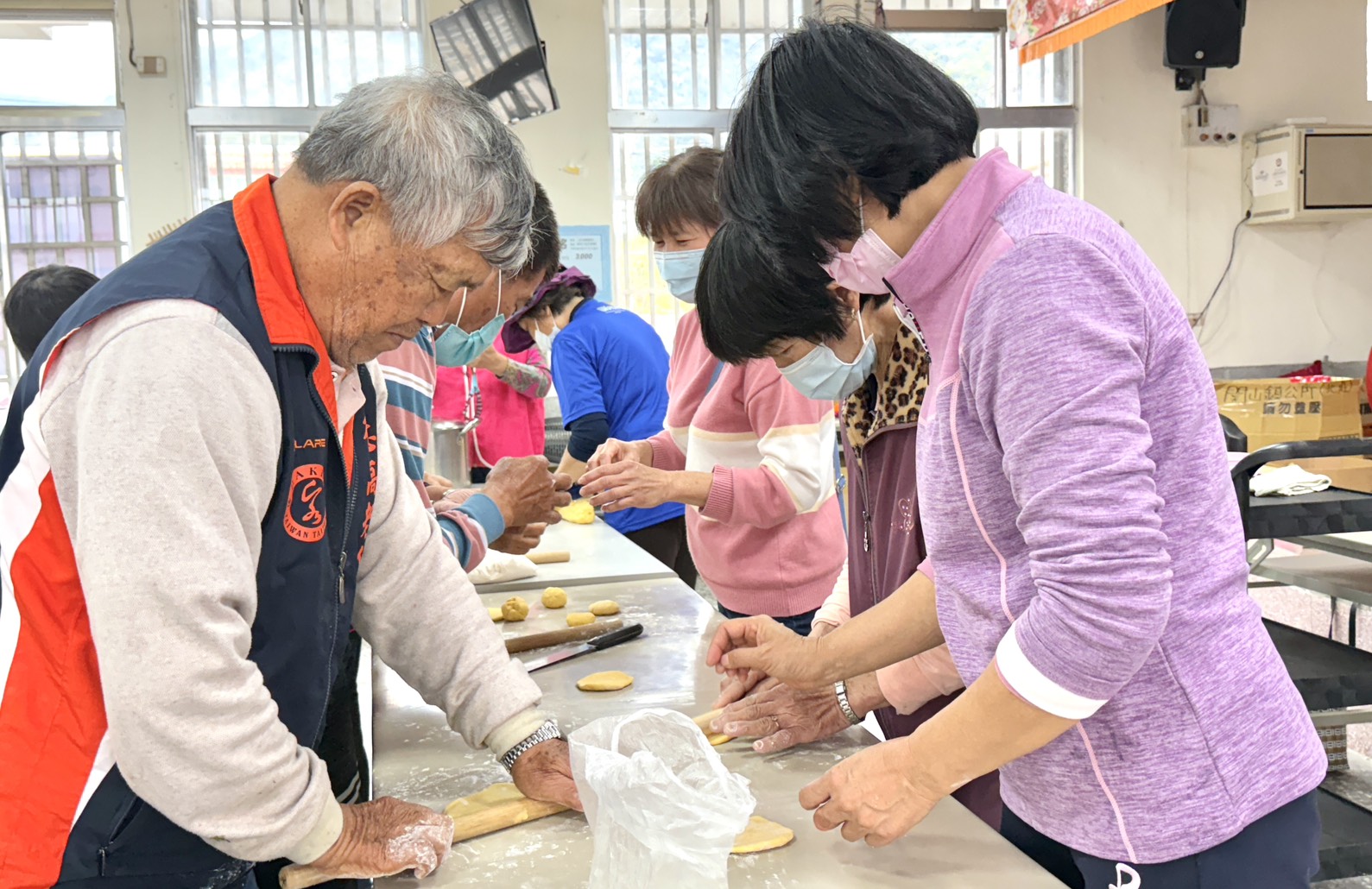 南瓜饅頭的製作活動經過揉麵糰將材料充分混合均勻,藉由搓揉的動作長輩彷彿正進行手部的運動;麵糰秤重分切後再予以塑形成為玫瑰花,活動就在歡笑交流中感受到手作的樂趣與成就感。臺東縣議員陳宏宗秘書周福安、北庄社區發展協會理事長鍾水源也來參與,協助將麵糰秤重分切的工作。