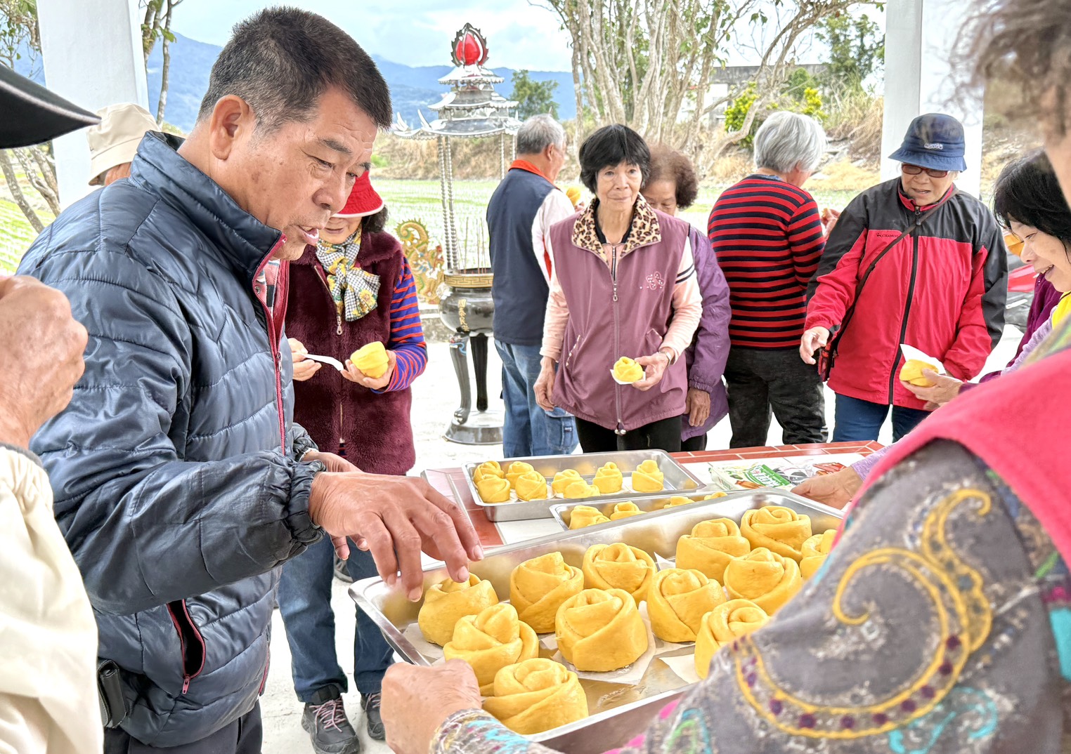 大夥合力七手八腳完成兩大蒸籠的南瓜玫瑰花造型饅頭,等待蒸熟的過程中唱起客家歌謠。好不容易盼到誘人的麥香氣等於宣告大功告成。一行人帶著玫瑰花饅頭、供品和金紙前往「北庄福德土地公」鍾水源理事長和周福安秘書的陪同共同向土地公祈求身體健康、農作物大豐收。