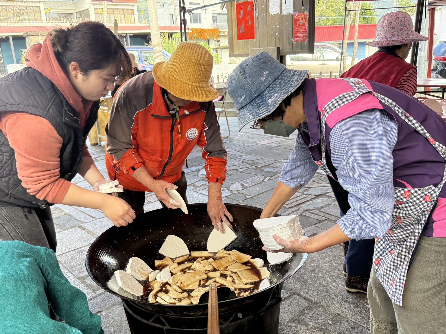 年糕製作開始必須先將泡好的糯米磨成米漿,然後再用木條壓出水分,上午則將壓好的糯米塊分切然後放入大鍋中與糖漿熬煮拌和。爐火區只見村民志工不斷用大木鏟攪拌鍋中米漿還得不時調整火候及起鍋時間,人力分裝將起鍋熱騰騰的年糕秤重,誘人的香氣讓有些人在現場就「凍未條」先嚐起來直說讚。