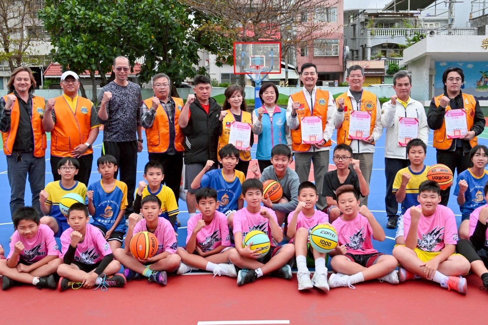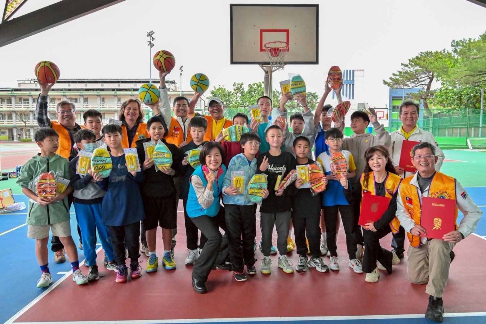 一行人隨後前往三校籃球場舉行致贈儀式,由鄉長游淑貞代表各校回贈感謝狀。同學們排成一列開心地接下嶄新的籃球與跳繩,齊聲向鄉長與獅子會的叔叔阿姨們致謝。現場游鄉長與獅子會成員也親切地和同學們一起打籃球、互動熱絡,氣氛十分活潑歡樂。