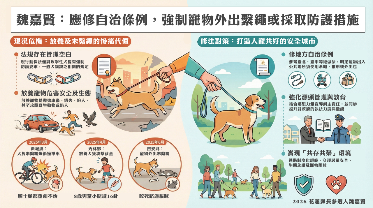 近年寵物放養或外出未繫繩所引發的咬傷與交通事故頻傳,惟《動物保護法》修法進度遲滯,地方政府多仰賴自治條例作為管理依據。對此,花蓮縣長候選人魏嘉賢表示,在中央法規尚未完成修正前,花蓮應參考臺北市、新北市及臺中市等地作法,強化寵物源頭管理機制,以兼顧民眾安全與動物福祉。