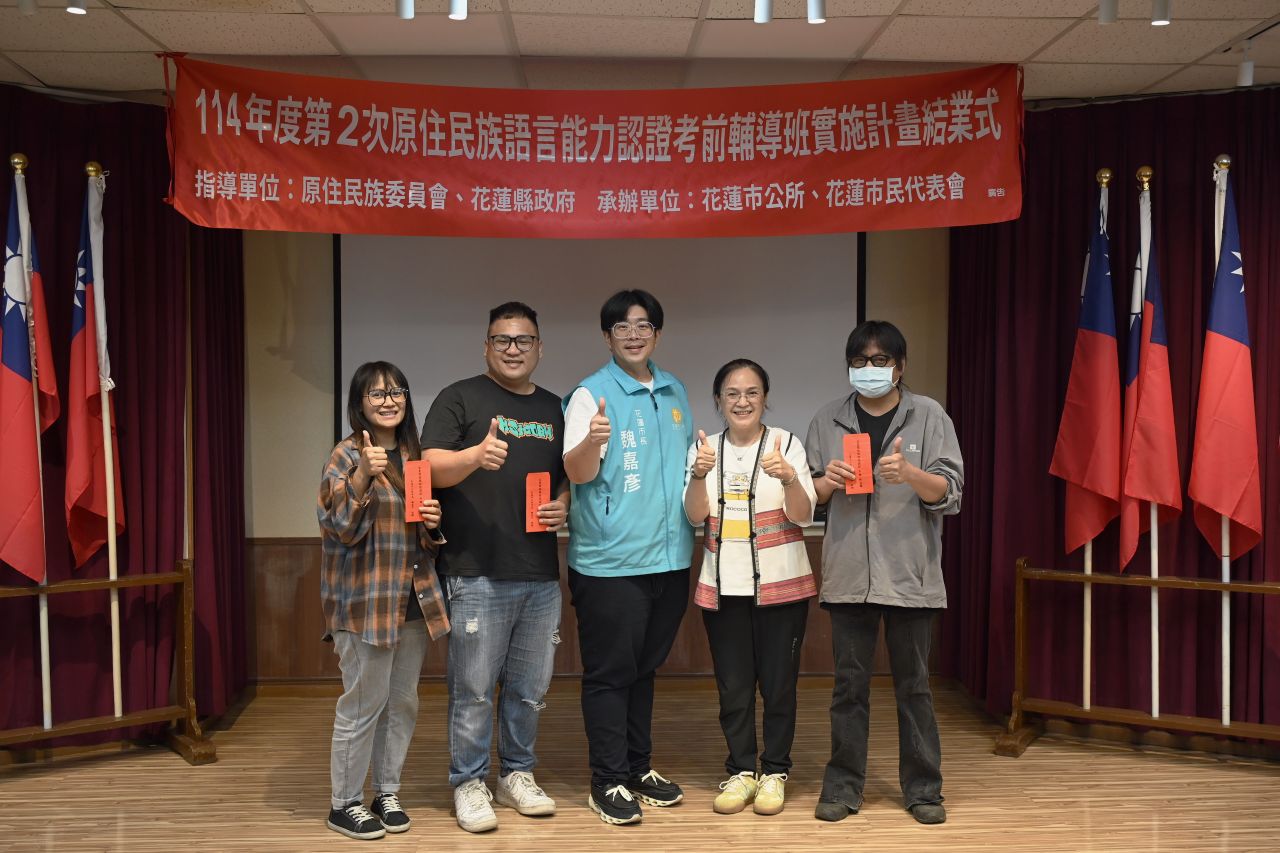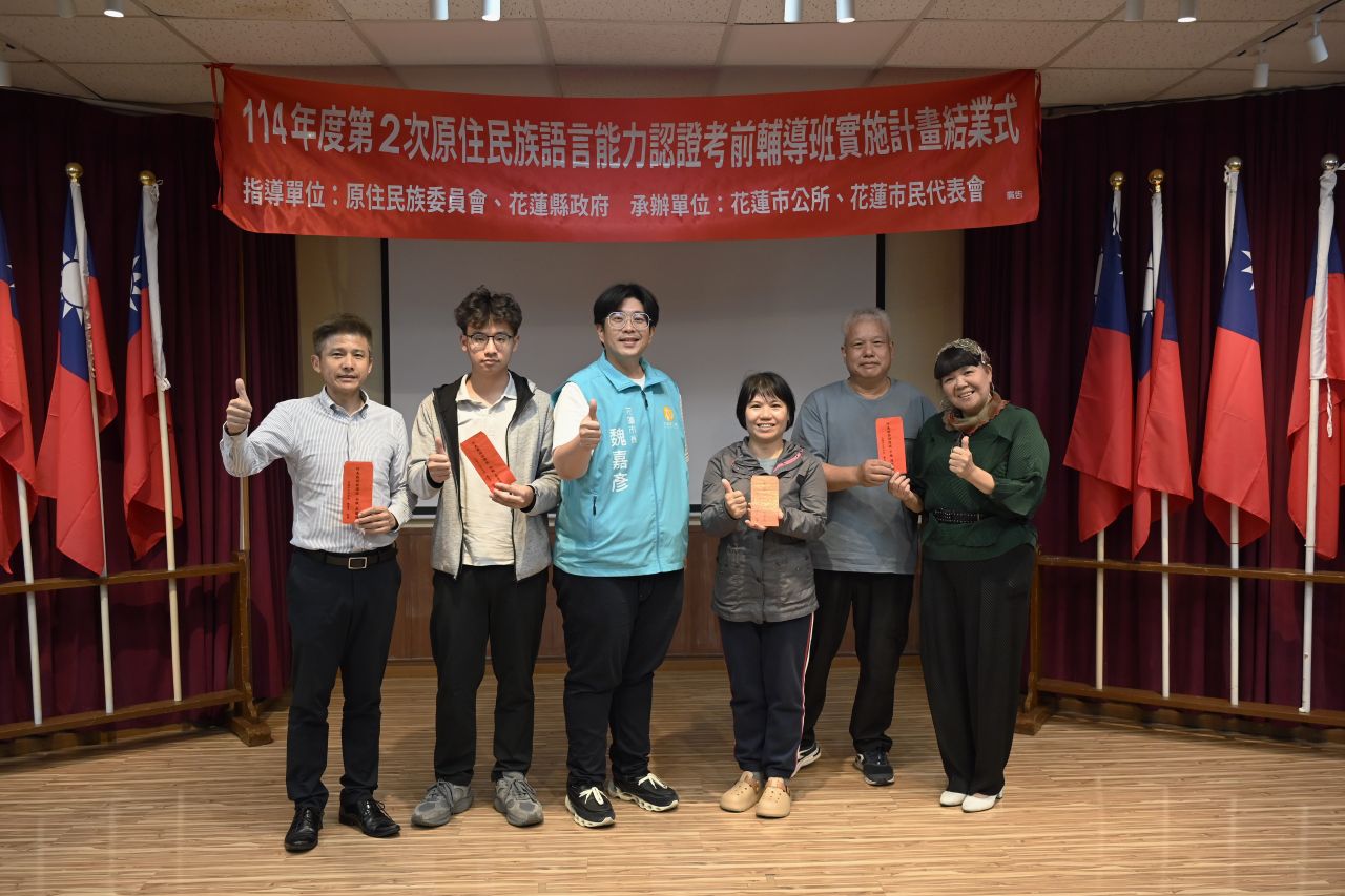 為推動原住民族語言傳承,花蓮市公所日前開辦撒奇萊雅、阿美及太魯閣三項族語認證輔導班,共吸引36位族人踴躍參加,並於日前舉行結業式。市長魏嘉彥親自出席,頒發結業證書予學員,並致贈感謝狀給三位講師嚴麗、汪秀萍及鄭以晨,感謝其專業教學與用心付出。