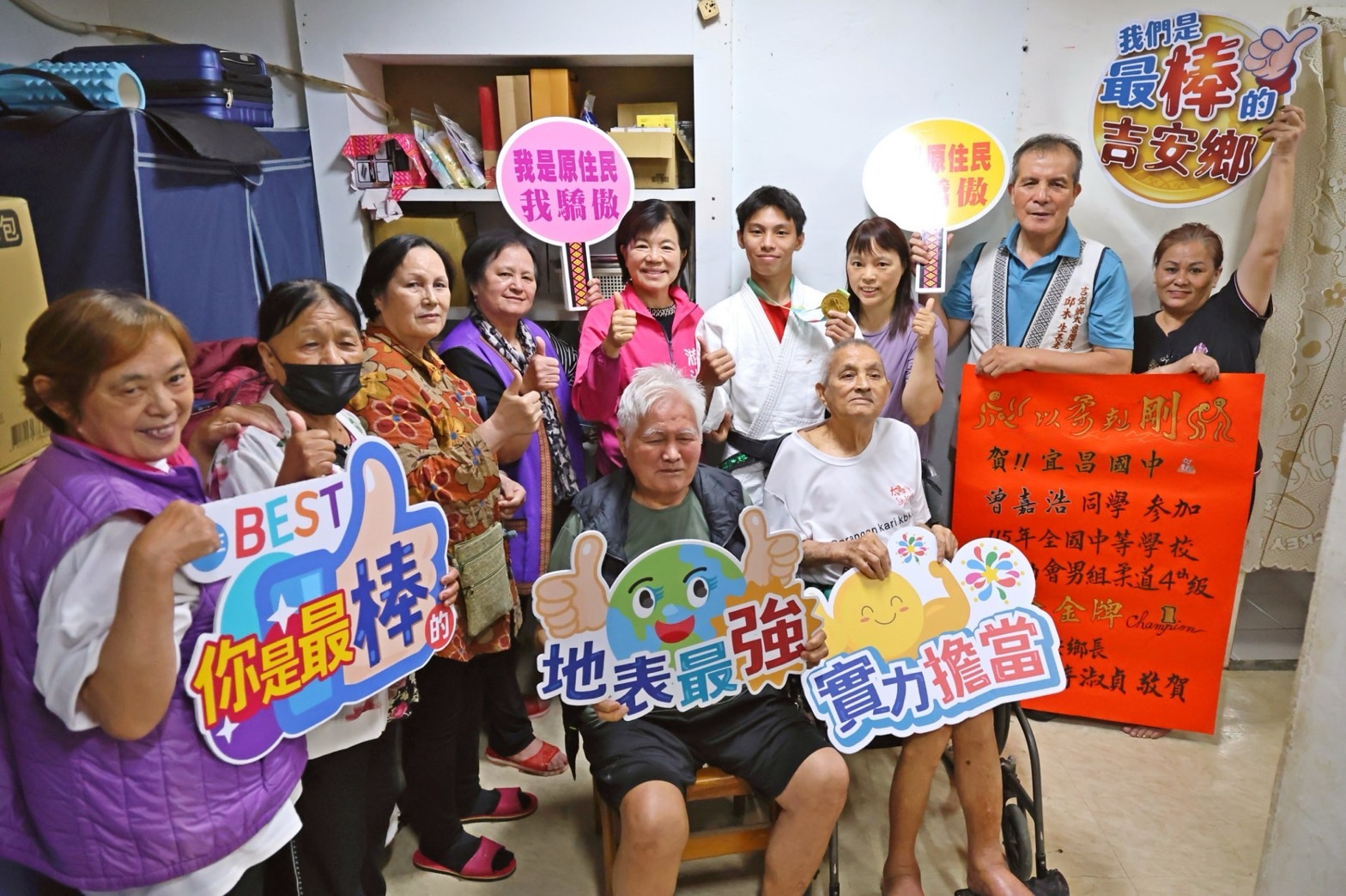 吉安鄉25日洋溢著如家人團聚般的溫暖與喜悅氛圍,鄉長游淑貞在公所團隊陪同下,親赴福興村前長老曾正義家中,表揚其孫就讀宜昌國中九年級的曾嘉浩同學,張貼紅榜與致贈獎勵金,肯定他於115年全國中等學校運動會中,勇奪柔道國中男子第四量級金牌的傑出表現。這面金牌不僅是宜昌國中創校以來的首面,更是吉安鄉與花蓮縣在柔道這個量級歷史首金,為地方寫下榮耀新頁。活動在曾家人熱情迎接中展開,以母語歌聲與舞蹈迎賓的方式,歡笑與掌聲交織下,展現濃厚的人情味與家族凝聚力,也讓這份榮耀更顯珍貴動人。